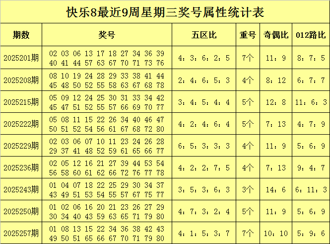 福彩激昂8第2025257期(上周三)奖号回来:01 08 13 15 22 34 36 38 42 43 49 50 51 65 66 67 70 71 79 80,其中奖号奇偶比为10:10,五区比为4:1:5:3:7,012路比为5:9:6,包含7个重号01、34、43、65、71、79、80。
